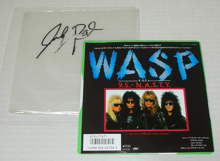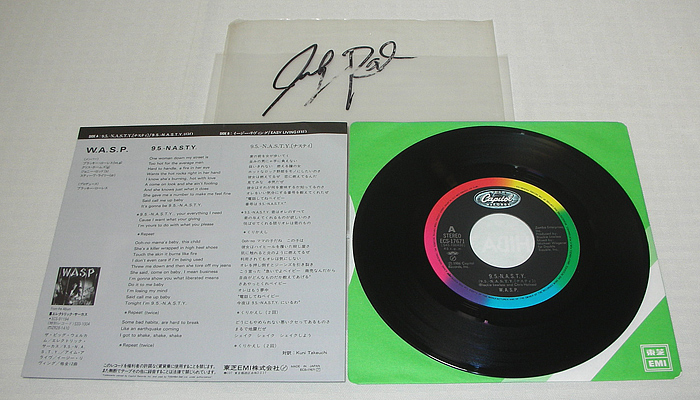 95 Nasty Japanese rare 7'' vinyl by Toshiba Emi [ECS-17671 (S45-100450 on side`s A label, S45-100467 on side`s B label)] includes full color insert & green record label sleeve. Also includes the track ''Easy Living'' (Uriah Heep cover). This superb rarity has Johnny Rod`s sign on its protective sleeve.